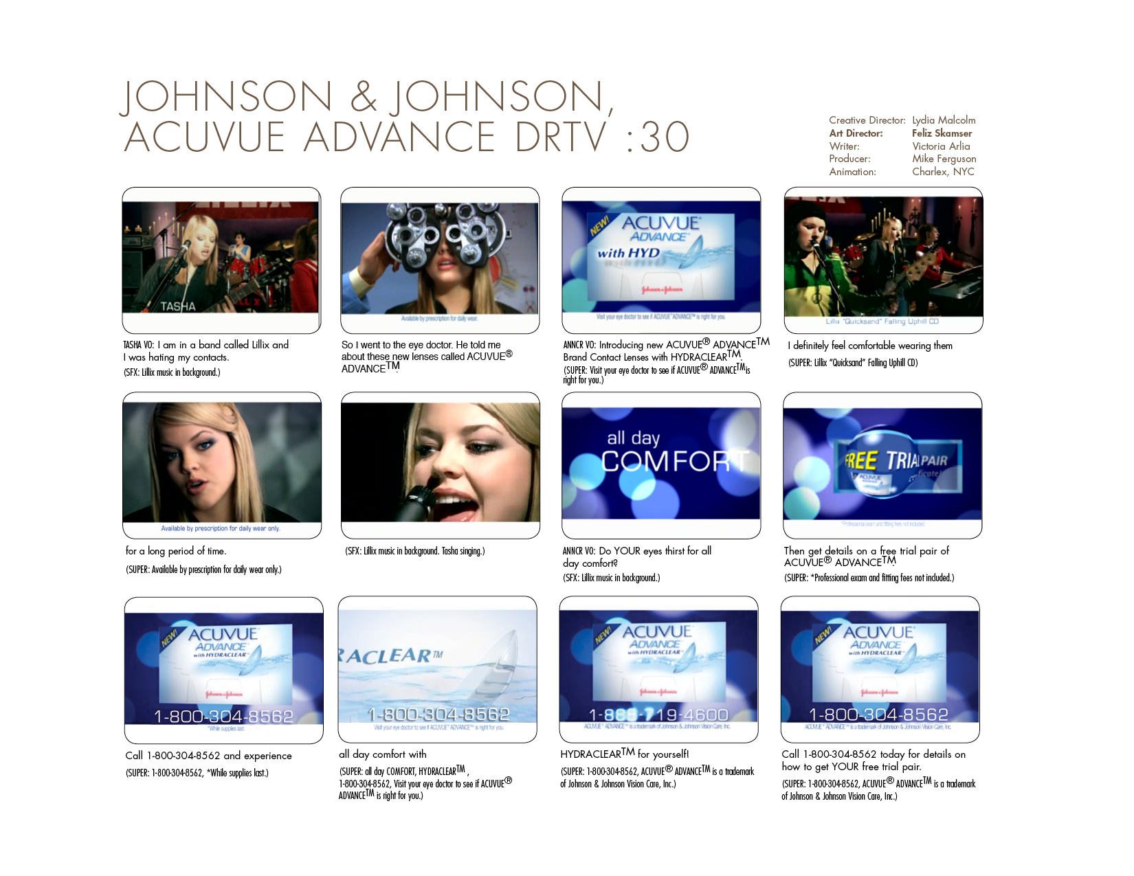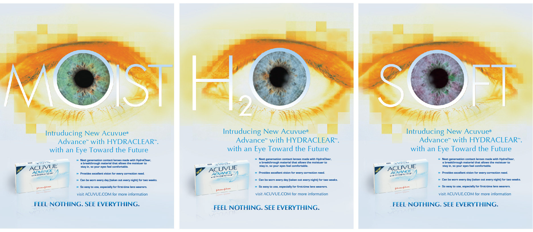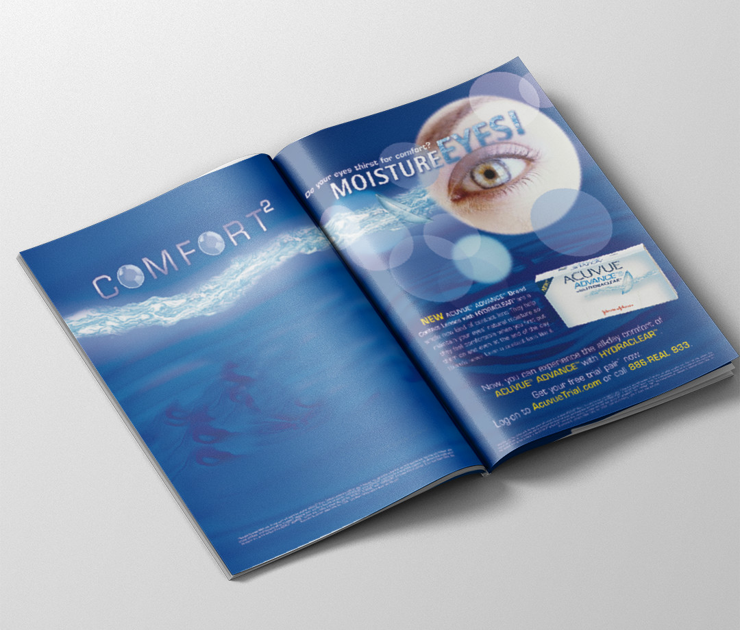 Acuvue Advance from Johnson&Johnson was looking to update their DTC Pharma campaign promoting thier new contact lenses with Hydraclear technology. Targeting young contact lenses wearers between 18 and 30, I leverage the product benefits of moisture, softness, and hydration in an aesthetic and bold solution that empathized with the trendy, tech-savvy consumer group. It was the clear winner in testing; millenials and the brand team loved it.